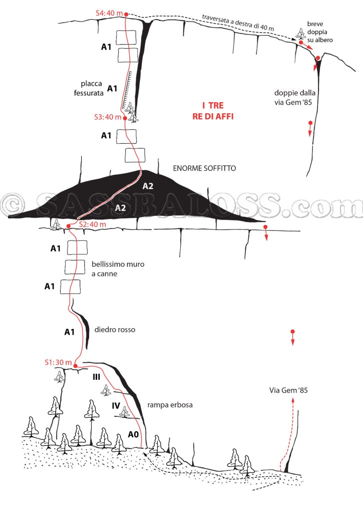 Itinerario d’arrampicata artificiale completamente attrezzato a fix (8 mm lungo i tiri e 10 mm alle soste) e sale sfruttando, nella parte bassa, i punti più deboli della parete. Gli apritori nell’effettuare il grande lavoro di pulizia delle prime lunghezze hanno rinvenuto 2 vecchi chiodi. Questi chiodi appartengono al tracciato originale della via Gem 85, oggi caduto in disuso a favore di un percorso più diretto (e riattrezzato a fix).