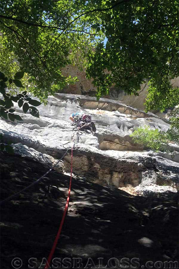 L5: dalla sosta salire verso destra e superare uno strapiombino. Continuare per rocce più semplici sino a uscire su dei terrazzamenti. Qui attrezzare la sosta (albero). 17 Mt., A1, I, 6 fix.