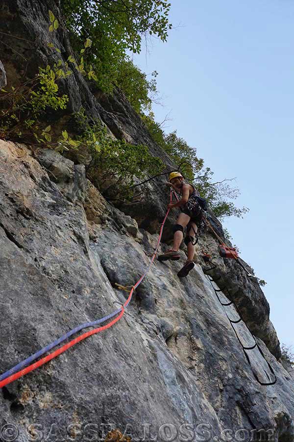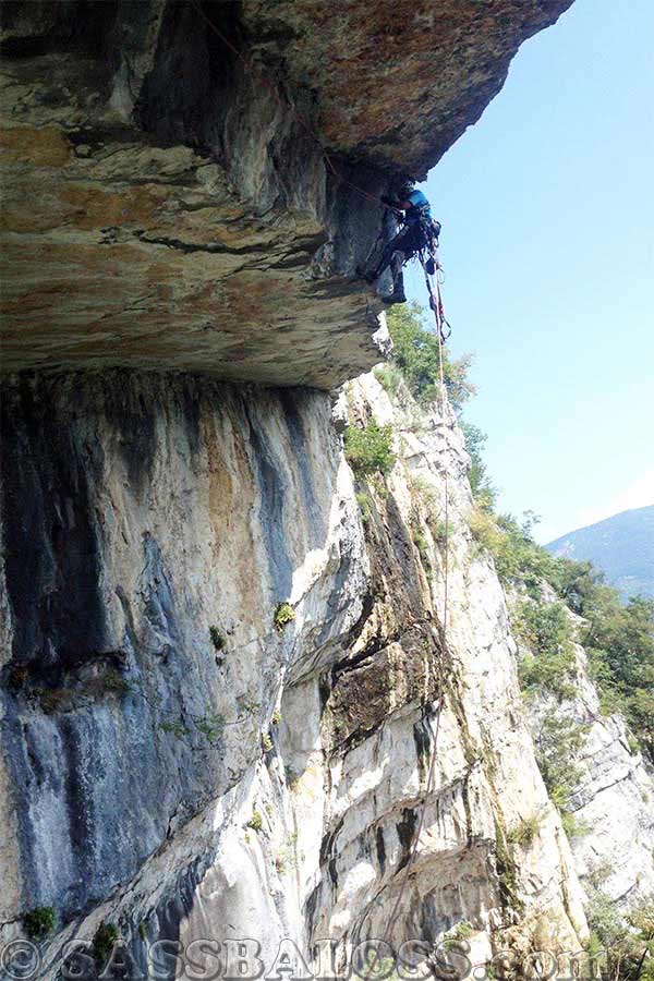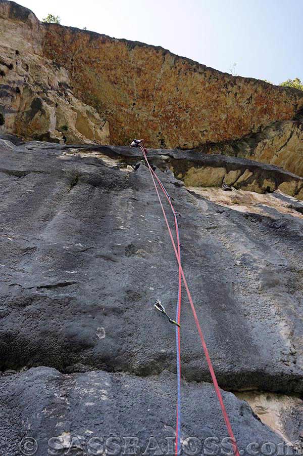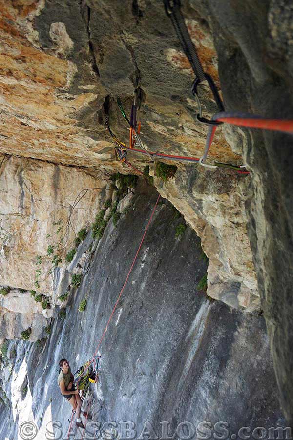 L4: salire in obliquo verso destra lungo la placca e superare un tratto verticale. Portarsi poi a sinistra in direzione della sosta (3 fix). 18 Mt., A3, A1, A3, 4 fix, clessidra da attrezzare.