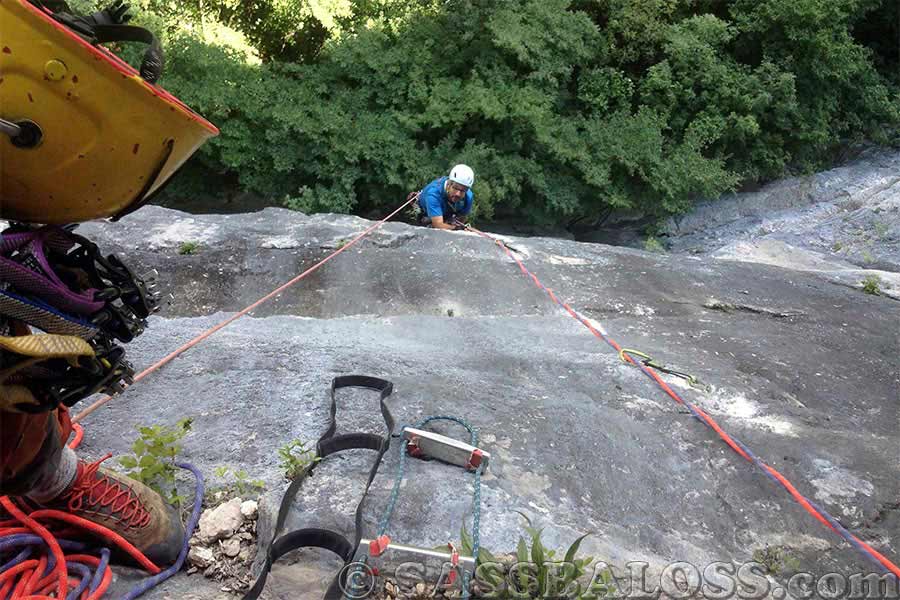Normale dotazione alpinistica. Utilizzare mezze corde da 60 Mt per un’eventuale calata da S3. Per ogni componente della cordata prevedere 2 staffe e fifì.