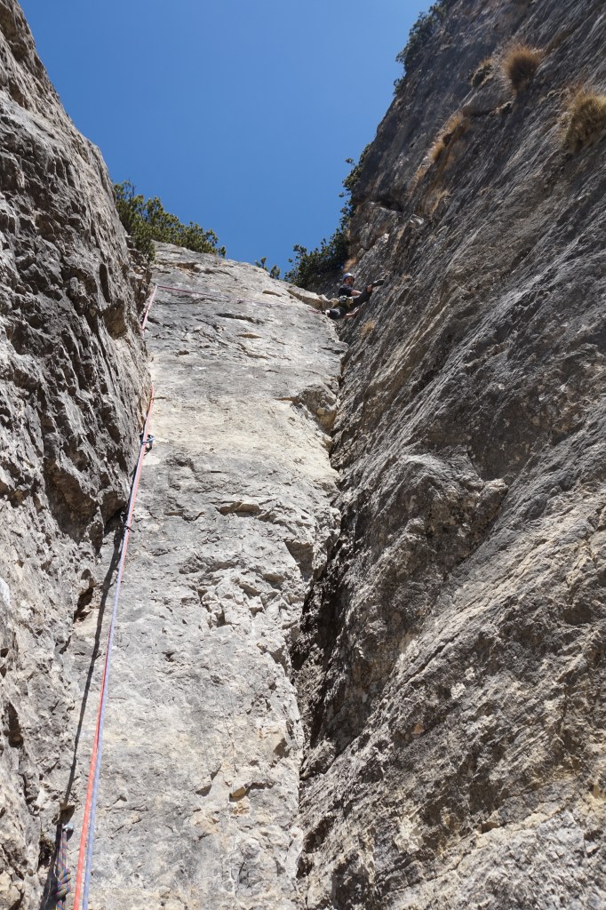 L1: salire il camino vincendo dopo pochi metri un passo in leggero strapiombo. Proseguire superando una strozzatura e guadagnare la sosta (3 chiodi+cordone) posta in corrispondenza di un piccolo terrazzino erboso sulla sinistra. 25 m, V, V+, V, 2 chiodi, 1 cordone su masso incastrato.
