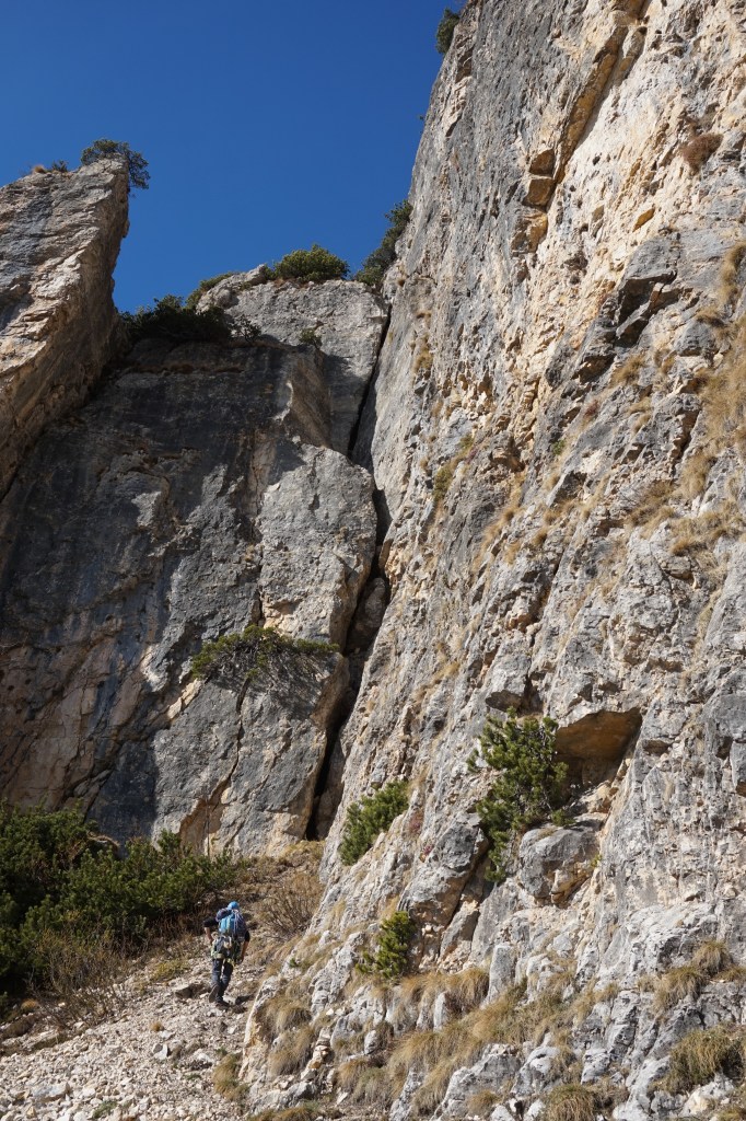 alla base della parete (continuando si raggiunge il bivio – ometto – per lo Spigolo Bellavista alla Torre Bovental).