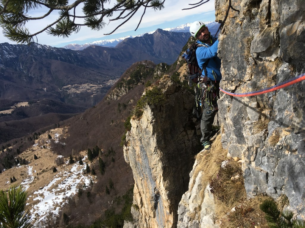 L3: dalla sosta traversare verso destra (viso a monte) sfruttando alcuni piccoli appoggi che poi migliorano. Proseguire in verticale superando con decisione la placca e raggiunta la fascia strapiombante riprendere a traversare verso destra lungo terreno via via più semplice. Doppiare uno spigolino e sostare (mugo+cordone). 40 m, VI- oppure A0, V, II, 5 chiodi di cui 2- con cordone.